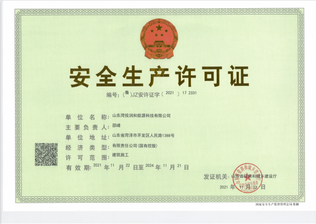 近日,菏投潤和能源科技有限公司安全許可證獲山東省住房和城鄉建設廳正式頒證,截止到2021年12月,菏投潤和能源科技有限公司已獲得安全生產許可證、承裝(修、試)電力設施許可證、建筑業企業資質證書(電力工程施工總承包三級、機電工程施工總承包三級)三項證書,這意味著公司步入了一個全新的發展階段。