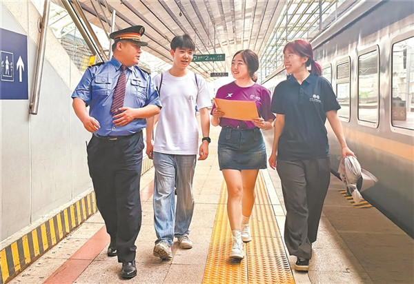 Z22次列車長司文東在北京西站交付信件后與清華學(xué)子合影。李 磊 攝