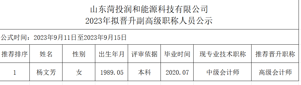 山東菏投潤和能源科技有限公司2023年擬晉升副高級職稱人員公示
