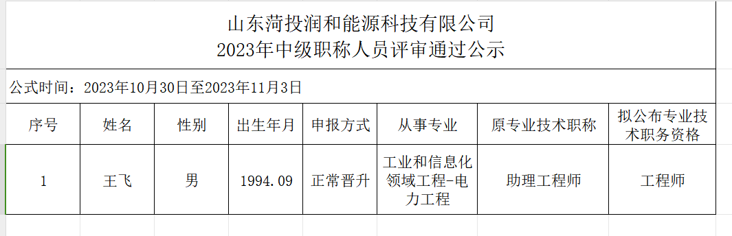 山東菏投潤和能源科技有限公司2023年中級職稱人員評審通過的公示