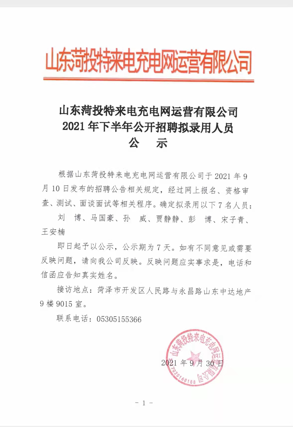 山東菏投特來電充電網運營有限公司2021年下半年公開招聘擬錄用人員公示